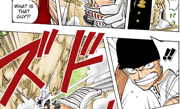 Zoro when he recovers from being knocked into the air and pinned when getting back up, is able to overpower this amount of force with just one leg