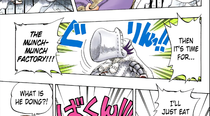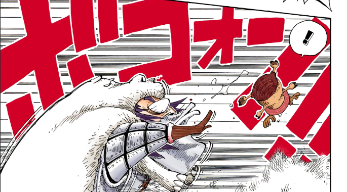 Skinny Wapol gets hit will A Gum Gum Bazooka probably being the longest we have seen Luffy ever stretch but we do not see the damage out come on Wapol in this Volume as he gets Team Rocketed