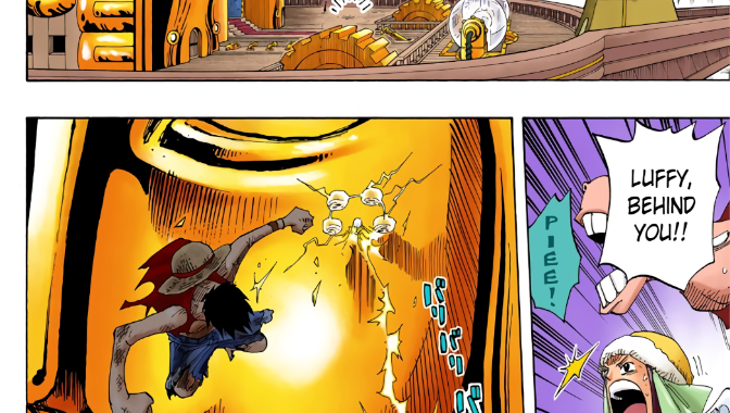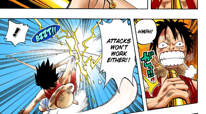 Luffy and Enel than engage in some physical hand to hand/trident showing great relativity to each other until Luffy stops using his mind to dodge and just relies on instinct in which Enel is than unable to tag Luffy which pretty definitively puts luffys speed above Enel with Enel only keeping up through his ability to predict attacks