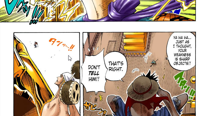 Enel than reshapes his staff into a trident and stabs at Luffy guessing that slashing damage can harm Luffy with Luffy confirming Enel's thinking which also supports his previous guess of blunt damage not working on Luffy