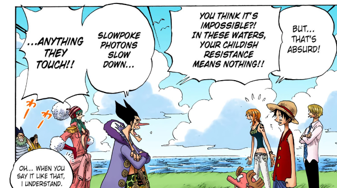 The villein of the arc Foxy has the ability to slow things down with a beam he admits from his hands given to him By the Slow Slow Fruit , Nami one of the smartest characters we have seen so far before the explanation by Foxy identifies the beams and in the explanation by Foxy , Foxy also calls them Light and even goes as far as saying the beams are made up of Slowpoke Photons